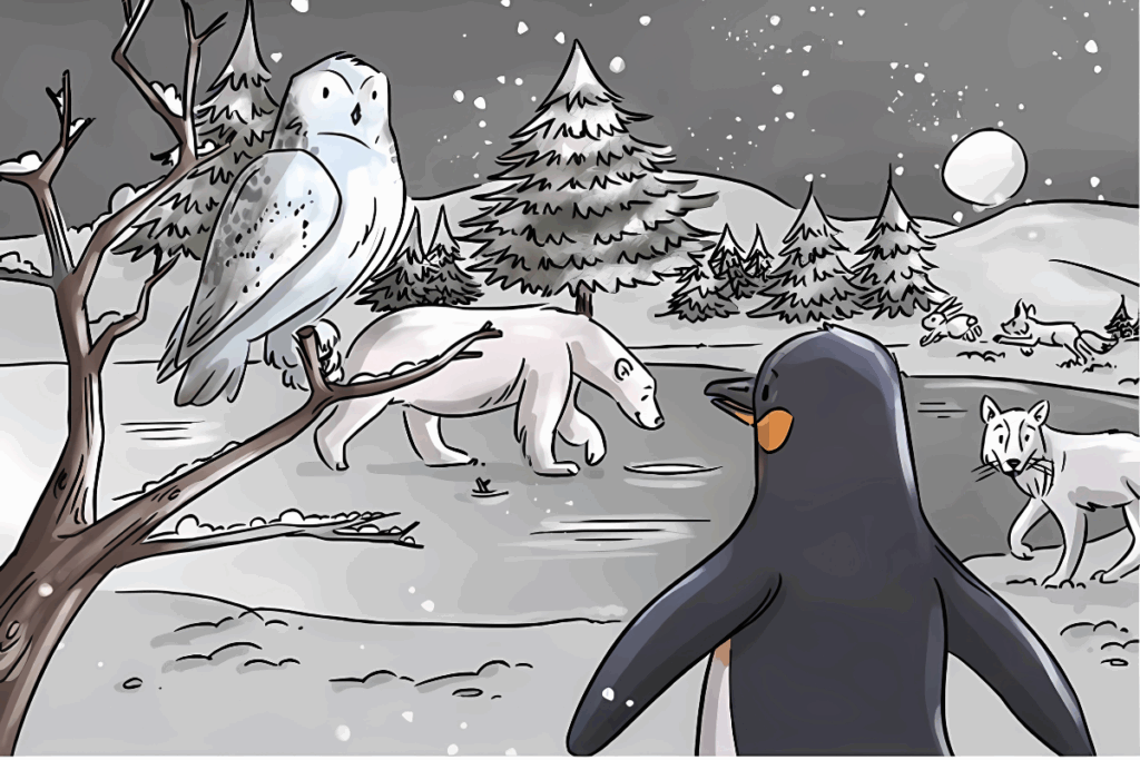 Afin d’expliquer ces thèmes, Animascience a mandaté l’autrice Anne Rougemont ainsi que l’illustratrice Nicole Devals afin de proposer l’histoire originale d’un manchot qui part dans le Grand Nord à la recherche de ses congénères.